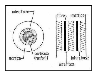 Tout d'abord il y a le renfort qui est généralement composé de fibre organique. Il sert de squelette au matériau, c'est lui qui va le renforcer, d'où son nom. Ensuite il y a la matrice. C'est elle qui va permettre la répartition des efforts imposés aux matériaux. Elle va aussi servir de liant avec les fibres constituant le renfort. Enfin, il y a l'interphase, qui est créée à l'endroit de rencontre des deux matériaux. Elle va faciliter la répartition de l'effort entre les deux matériaux.