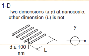 Ensuite, il y a les nanofibres, nanotubes, nanofilaments. Ces objets possèdent 2 dimensions à l'échelle nanométrique et une autre dimension beaucoup plus grande.